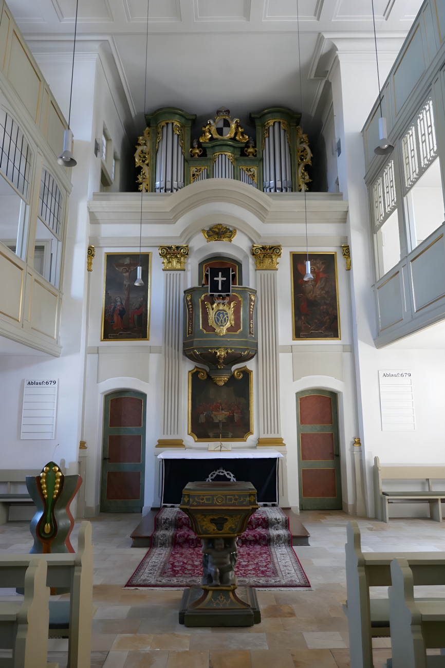 Im Inneren mit Kanzelaltar und darüberliegender Orgel. Doppelstöckige Emporen, im Westen über dem Eingang von der Patronatsloge unterbrochen, darüber das Monogramm von Markgraf Carl Wilhelm Friedrich.